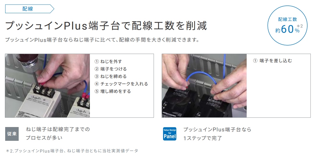 プッシュインPlus端子台を採用しており、ねじ端子と比較すると大幅に配線工数を削減できます。