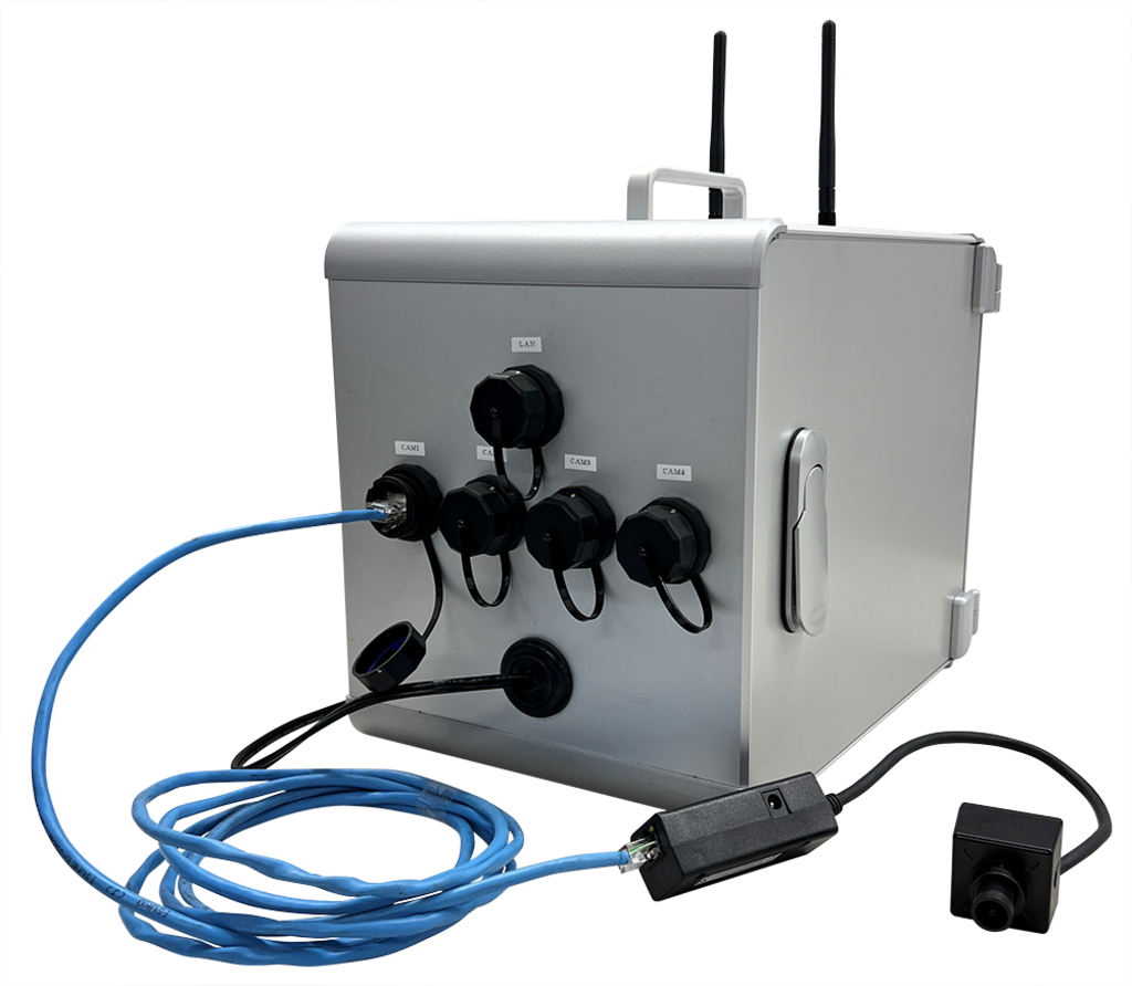 この製品は最大4つのカメラで一度に録画を行うことができ、広範囲の監視を効率的に実現します。また、現場にネットワーク環境がない場合でも、制御BOX内に搭載されたアクセスポイント機能により、タブレットPCなどの無線端末を使用して録画映像の確認やシステム監視を可能にしました。